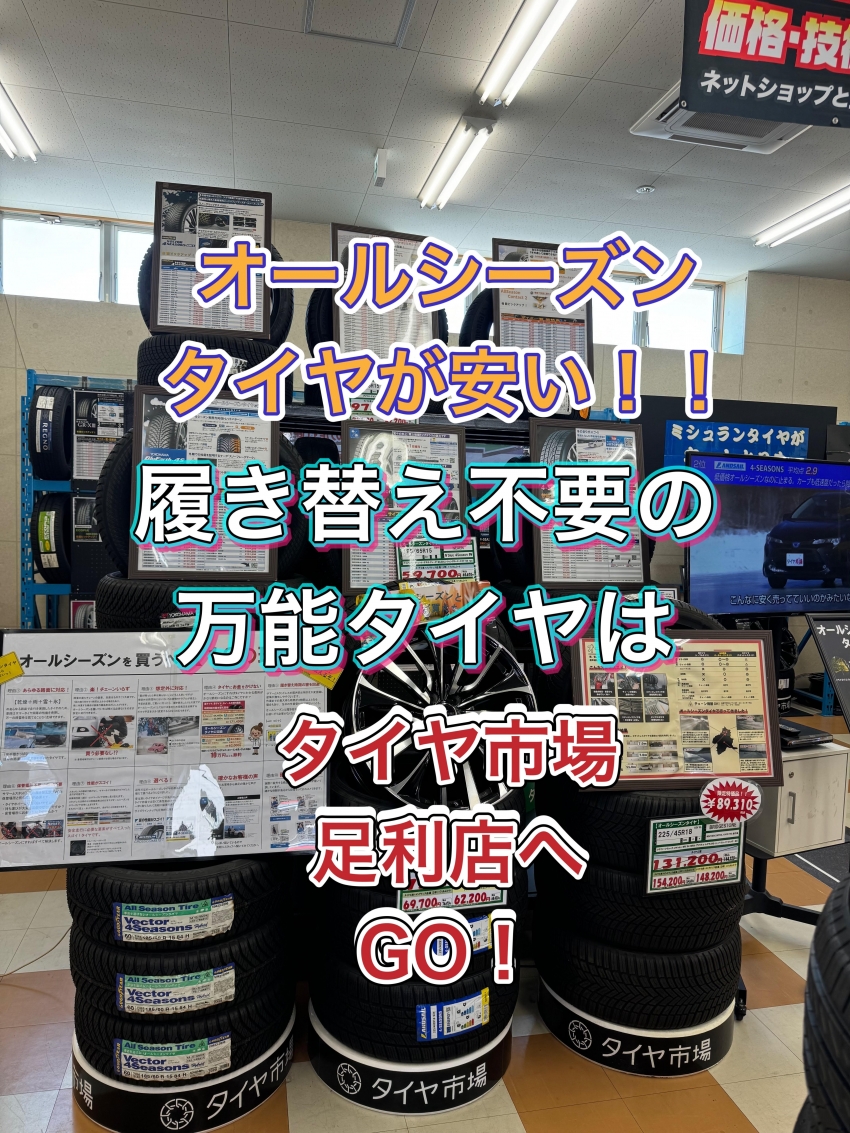今オールシーズンタイヤを買うならタイヤ市場足利店が断然お得!!ネットや他店よりも安い金額でご提供可能!雪道も走行可能な履き替え不要の万能タイヤ!足利・太田・桐生・邑楽エリアにお住いの方、その他の地域にお住いの方も是非!