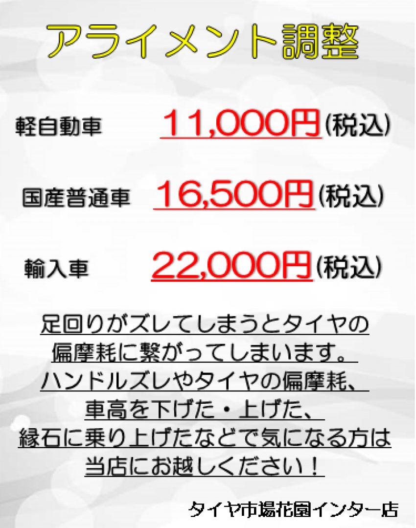 アライメント調整はタイヤ市場花園インター店で!!