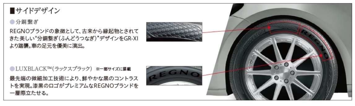 見た目もサイドのデザインが目を引きます。「分銅繋ぎ」という装飾が施されていて、プレミアムタイヤにふさわしい装いです。