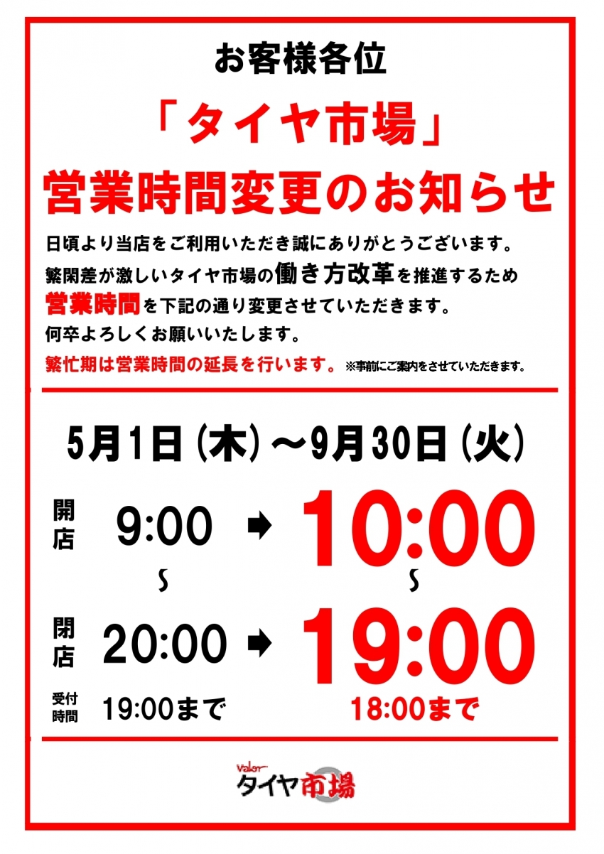 5月より働き改革の一環で営業時間の変更を致します。