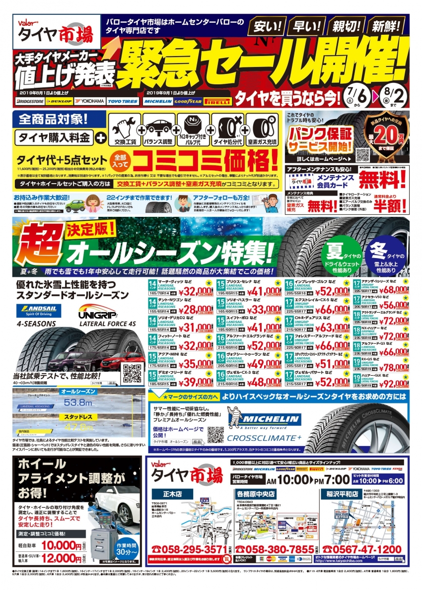 0706バロータイヤ市場B4_04裏共通.jpg兼用、一年中履けるオールシーズンタイヤを始め、軽自動車タイヤ性能で選べる3大オススメタイヤもお買い得!