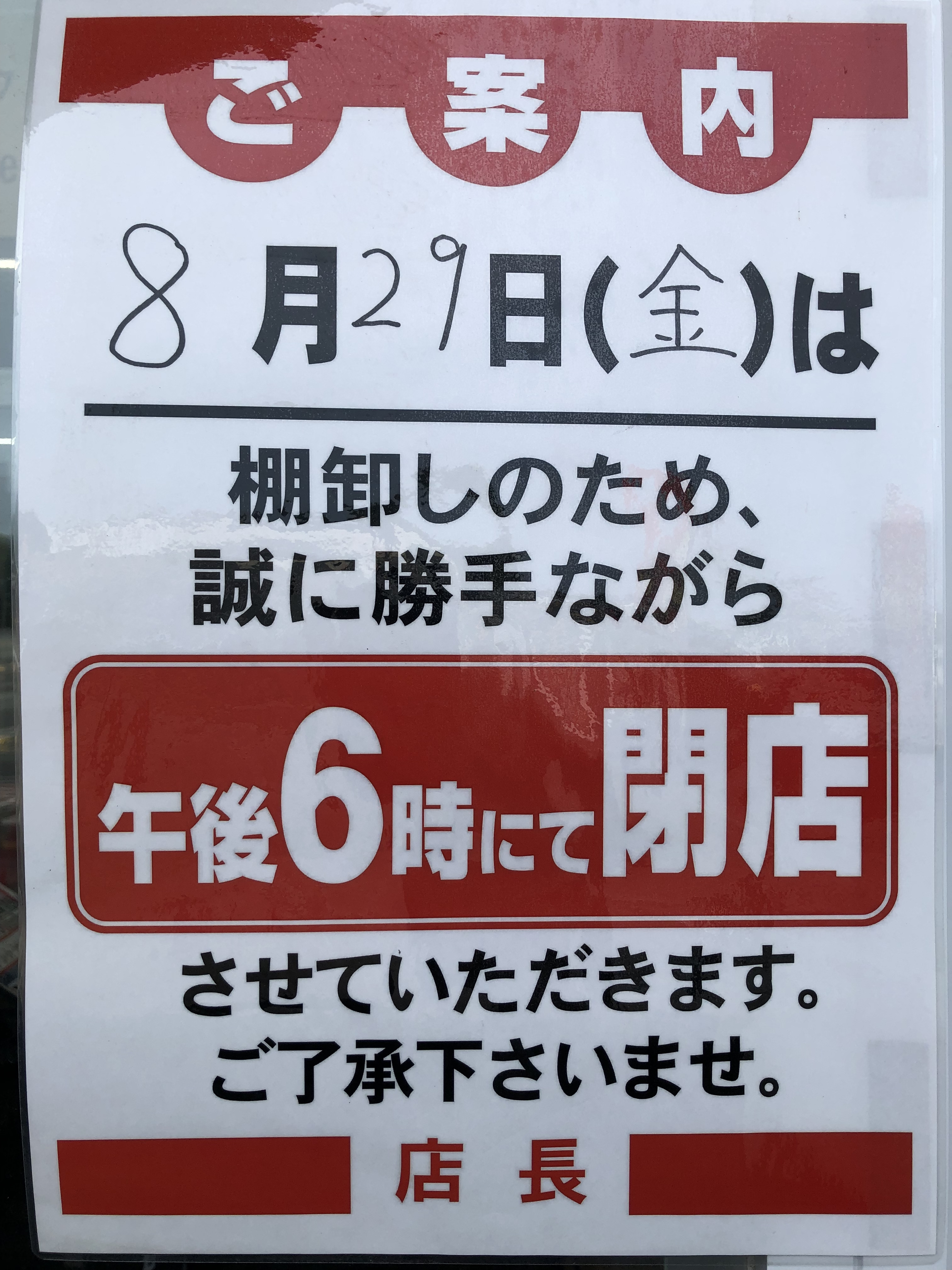 明日8/29(金)は、棚卸しのため、誠に勝手ながら午後6時にて閉店させて頂きます。ご迷惑をお掛けいたしますが、ご了承くださいませ。
