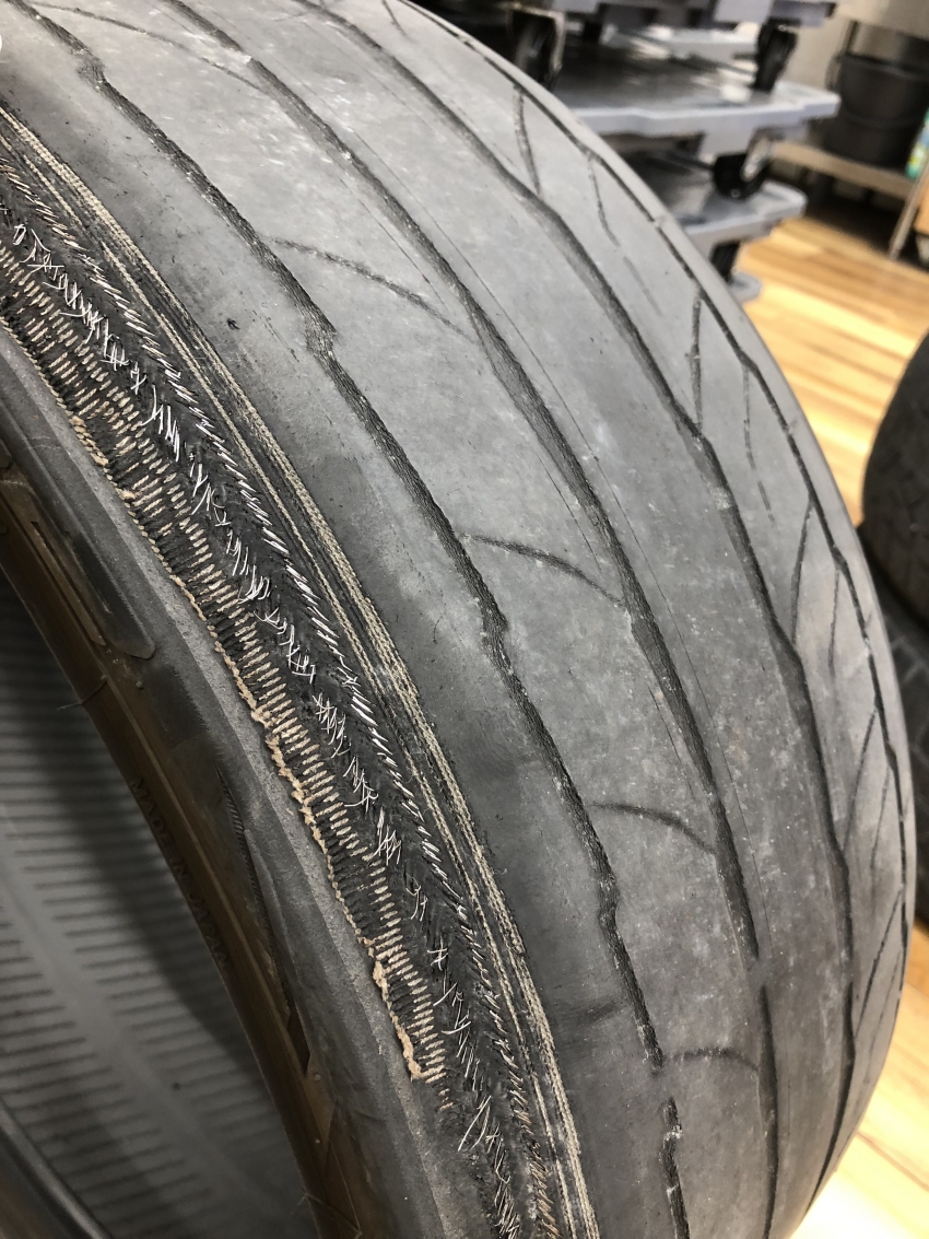こちらのタイヤ⚠ゴムが擦り減って中のコードやワイヤーが露出してしまっていて大変危険です!!いつバースト(破裂)してもおかしくない状況です。