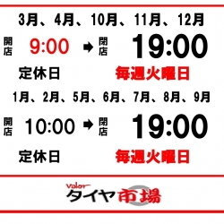AM9:00~PM7:00 (ピット作業受付:AM9:00~PM6:00)1月/2月/5月/6月/7月/8月/9月