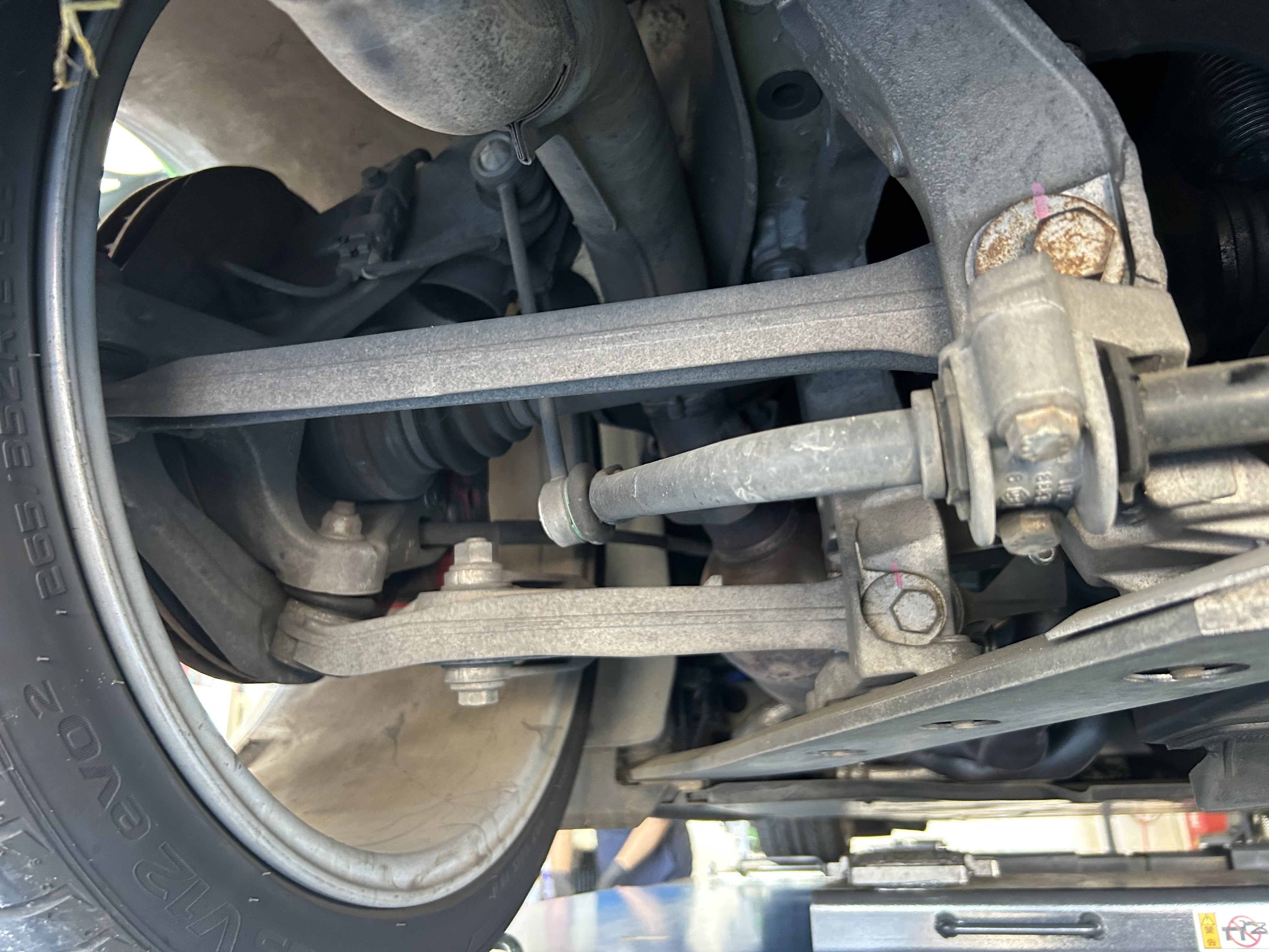 リアの偏心カムの位置は見やすい位置にありますが、ボディー剛性の補強バーやメンバーブレースがあり