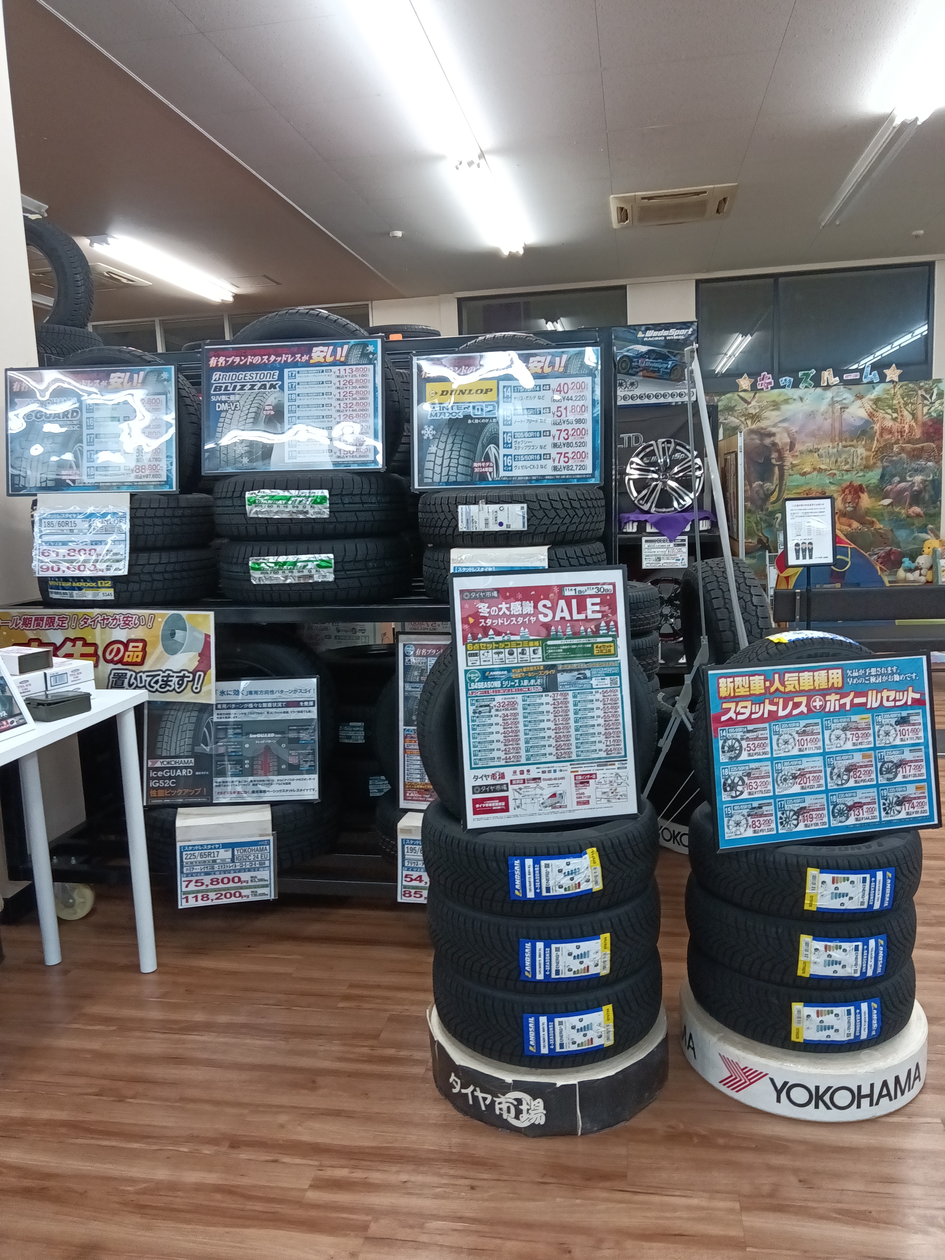 タイヤ市場加須店ではスタッドレスタイヤ、オールシーズンタイヤの在庫がたくさんごさいます。