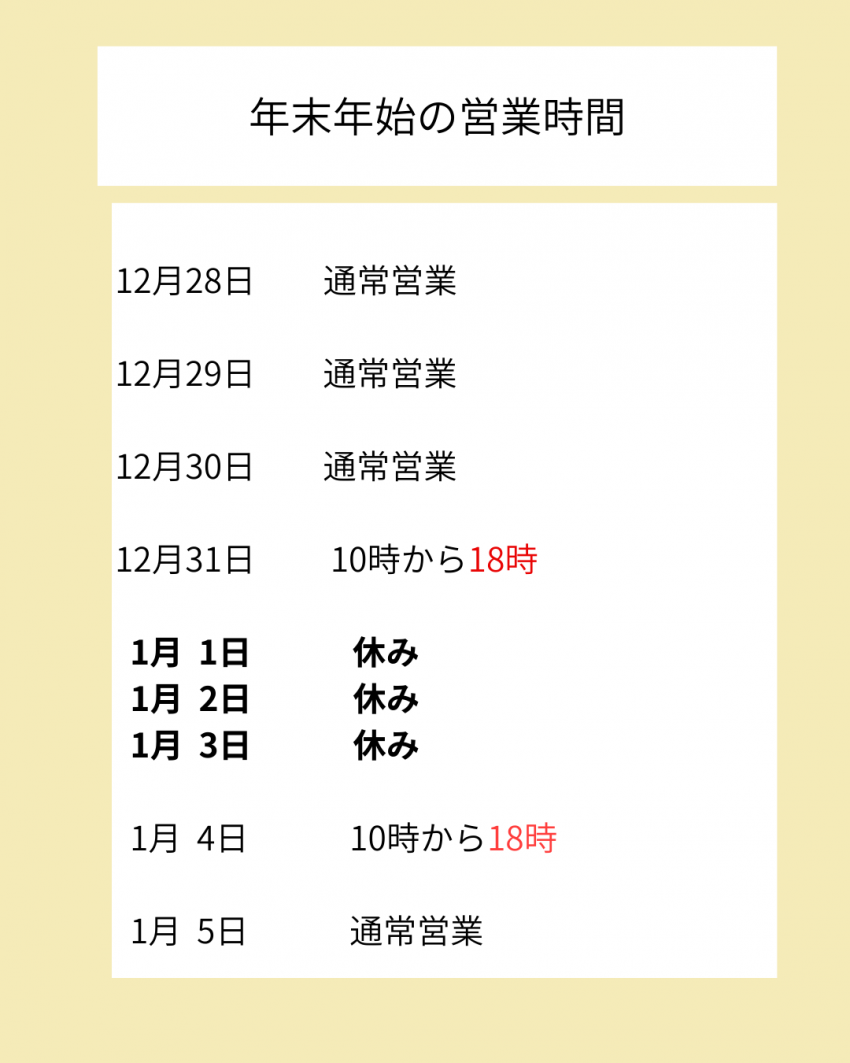 年末年始の営業日のご案内です!
