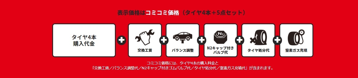 タイヤ市場のPOP表示価格はコミコミ価格です。(タイヤ4本+5点セット)