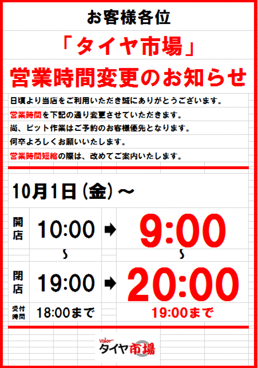 AM9:00~PM8:00(ピット作業受付:AM9:00~PM7:00)1月/2月/5月/6月/7月/8月/9月