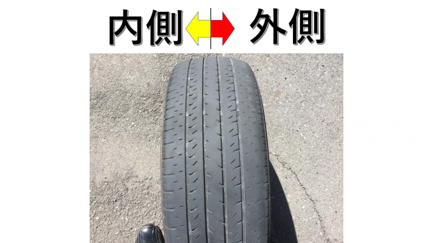 上記の画像、同じタイヤなのに内側と外側で減り方が違う事がお分かりになる事と思います。