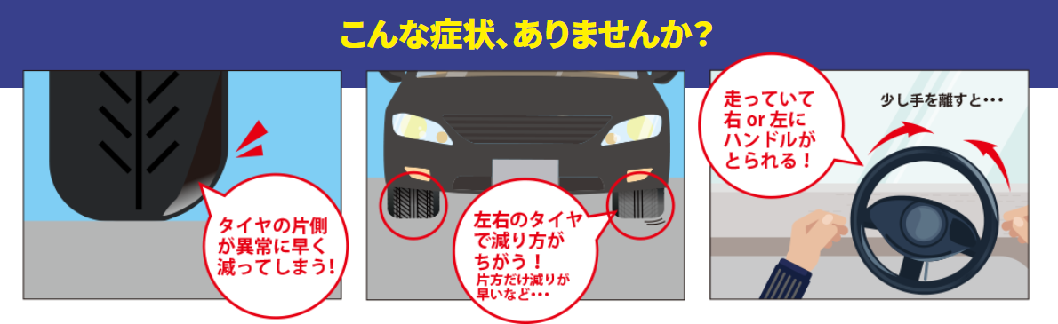 『アライメント調整って、耳にした事は有るけど詳しく知らない』という方も多いと思いますが、アライメントとは、車の車体に対するタイヤの取付角度の事を言いまして、車が新車の時は当然ベストの位置関係でタイヤが取り付けられているのですが、段差を乗り越える事の繰り返しにより少しずつズレたり、タイヤやホイール若しくは車両をぶつけたりしますとどうしても狂いが生じてしまい、下記の様な現象が発生致します!!