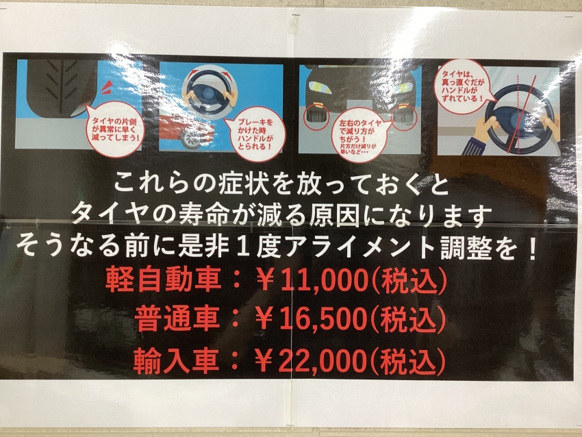 アライメント調整はお車の骨格。年数、距離を乗る事でそれが狂う事があります