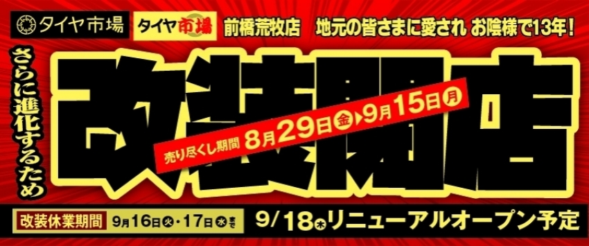 タイヤ市場前橋荒牧店 改装閉店セール中であります(`・ω・´)ゞ