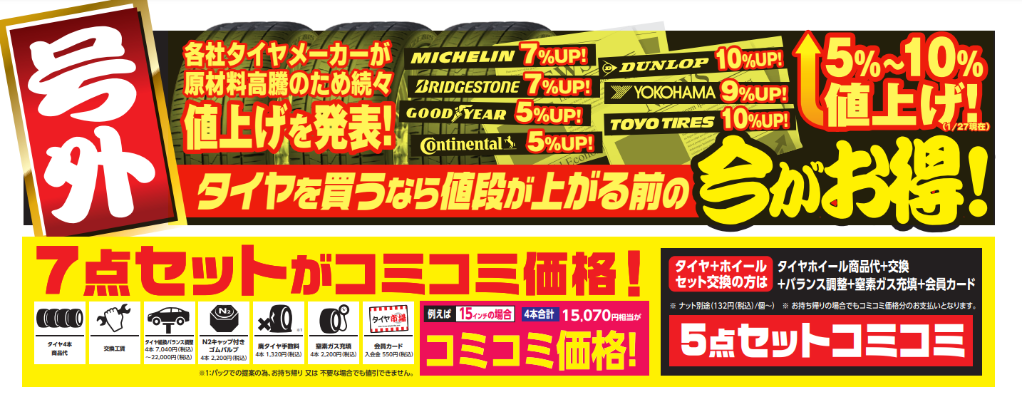 タイヤを買うなら今が安い!各社タイヤメーカーが値上げを発表!!