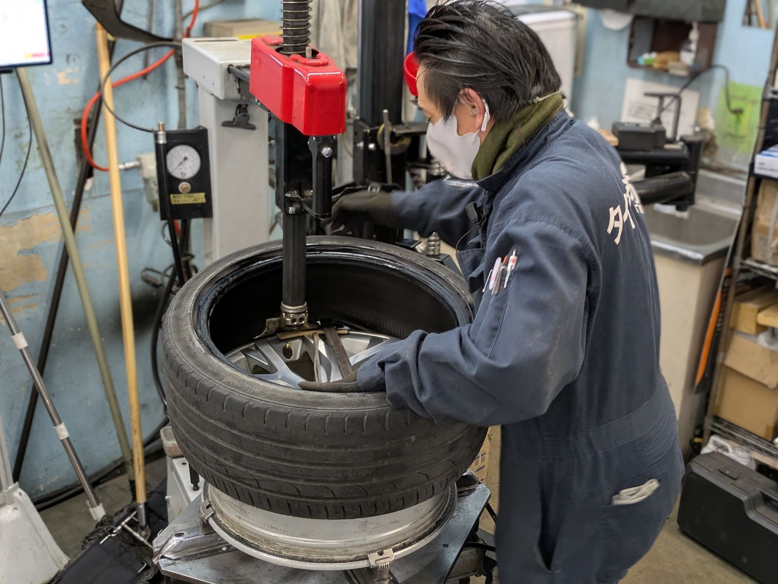 ホイールに傷をつけないよう、慎重かつスピーディーに作業を進めます。スタッフの眼差しも真剣そのもの。 「ネットで買ったタイヤだから適当に...」なんてことは絶対にありません。当店でご購入いただいたタイヤと同じ熱量で、一本一本丁寧に向き合います。