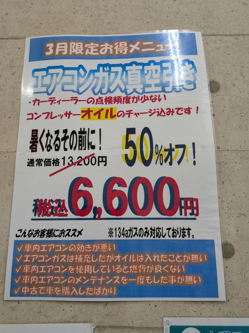 【3月限定 お得メニュー】 エアコンガス真空引き(コンプレッサーオイル補充込み) 通常価格 13,200円(税込)のところ... なんと 50%OFF ➡ 6,600円(税込)!! ※134aガス車限定