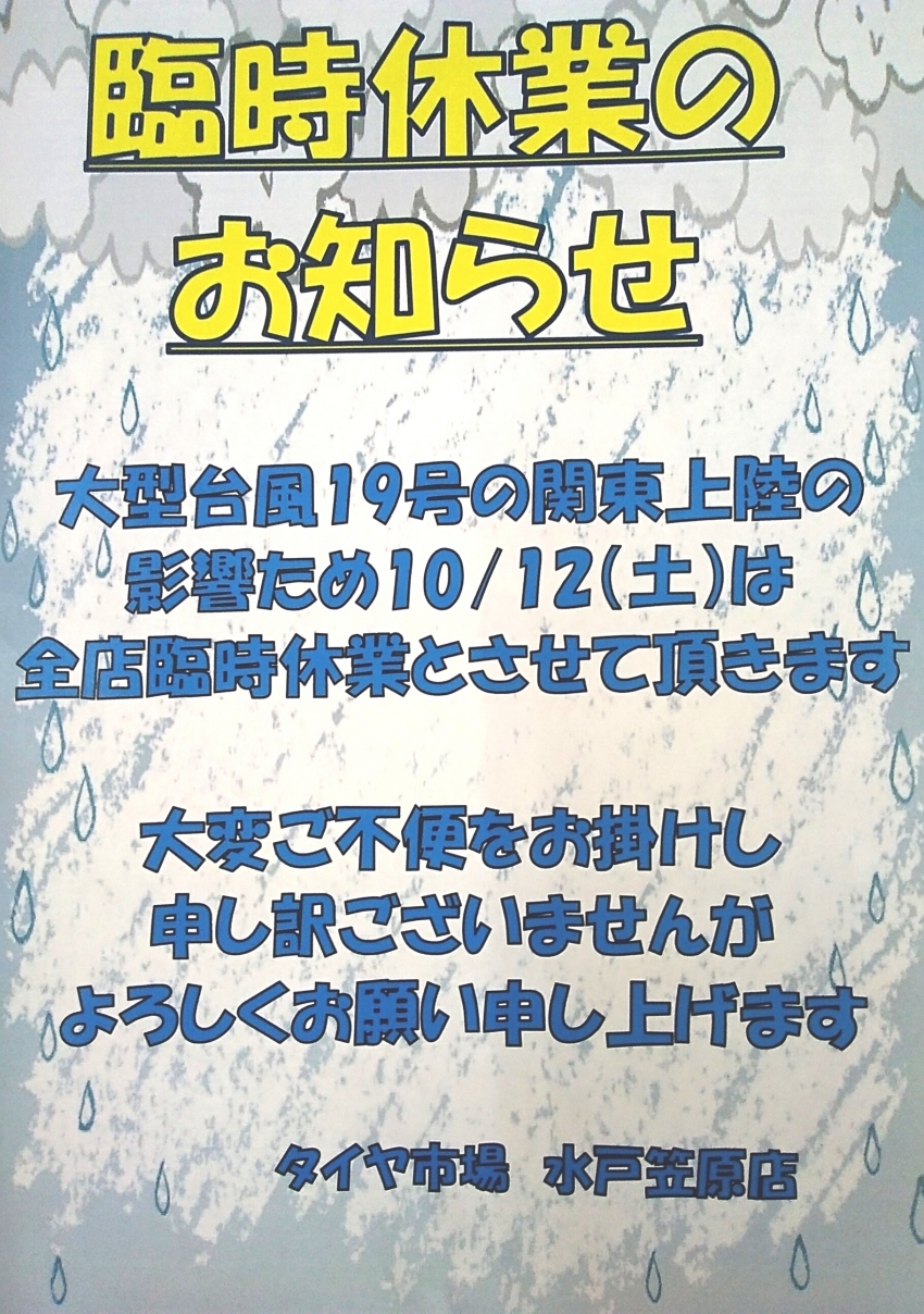 誠に勝手ではありますが、明日10月12日土曜日の営業を台風19号の影響の為、臨時休業とさせて頂きます。