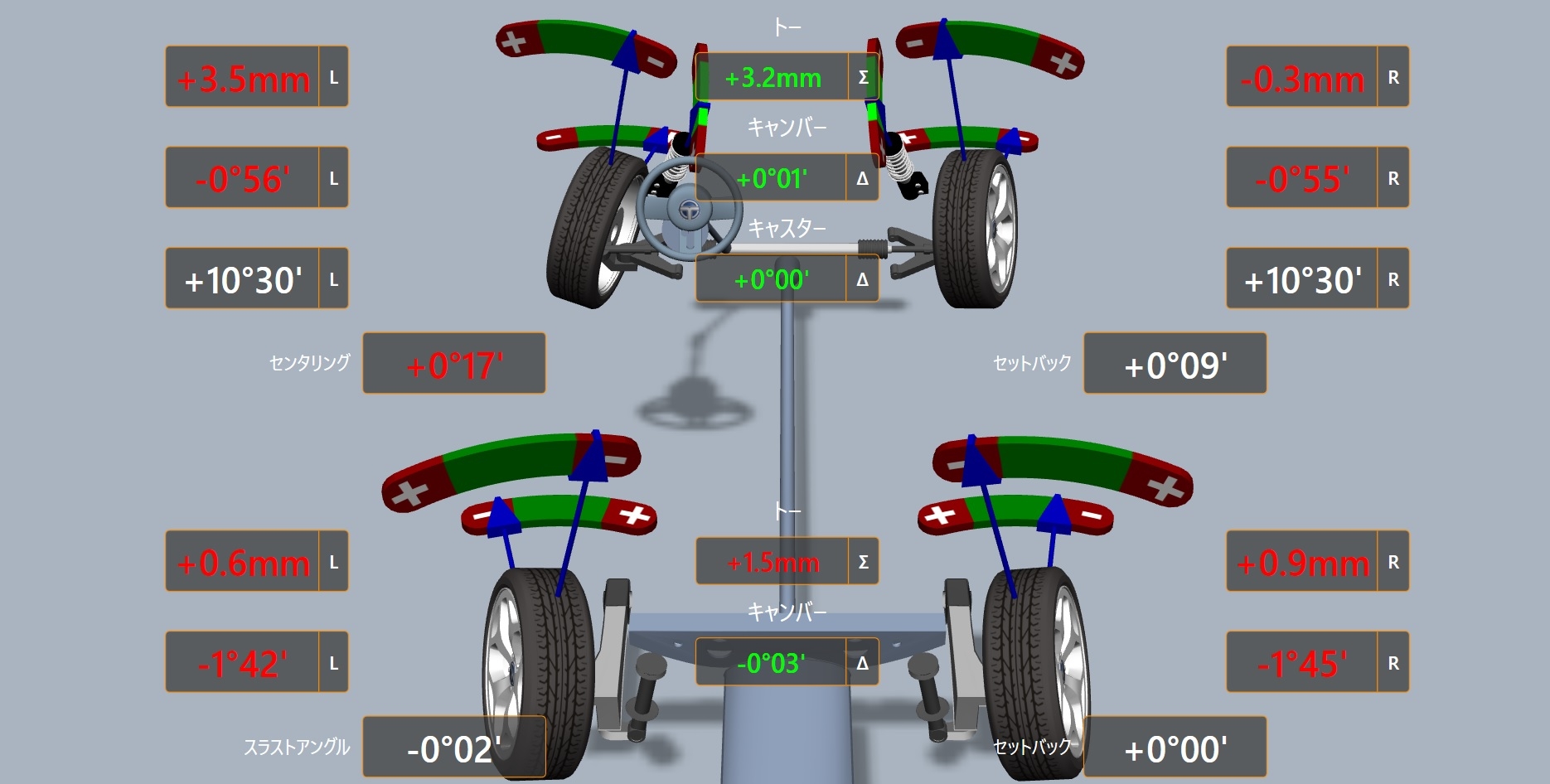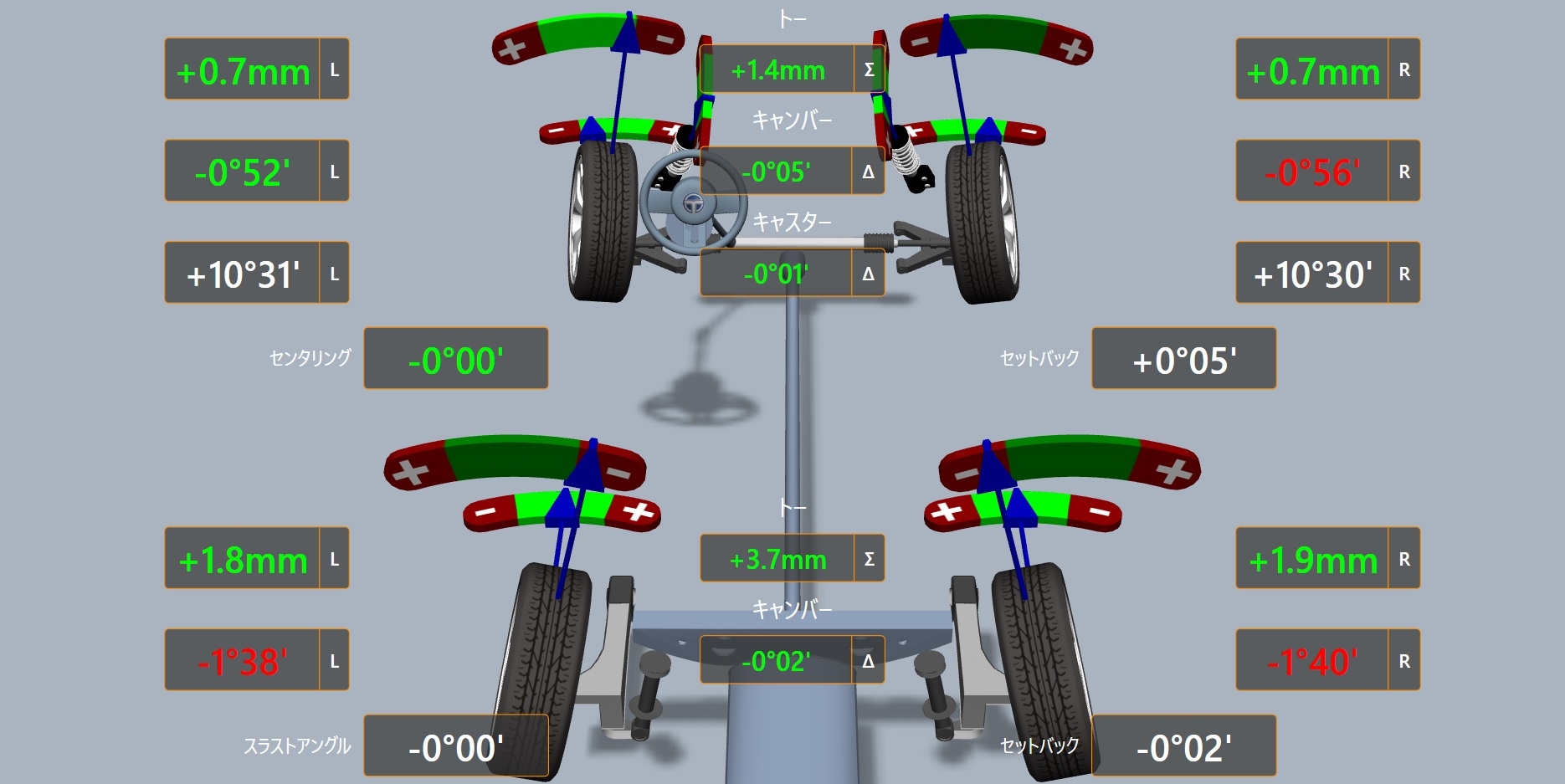 全体的に基準値を外していますがやはり左フロントが大幅にトーインとなっています。