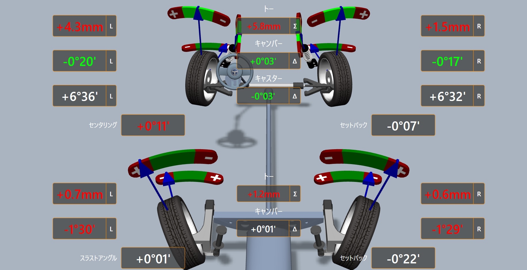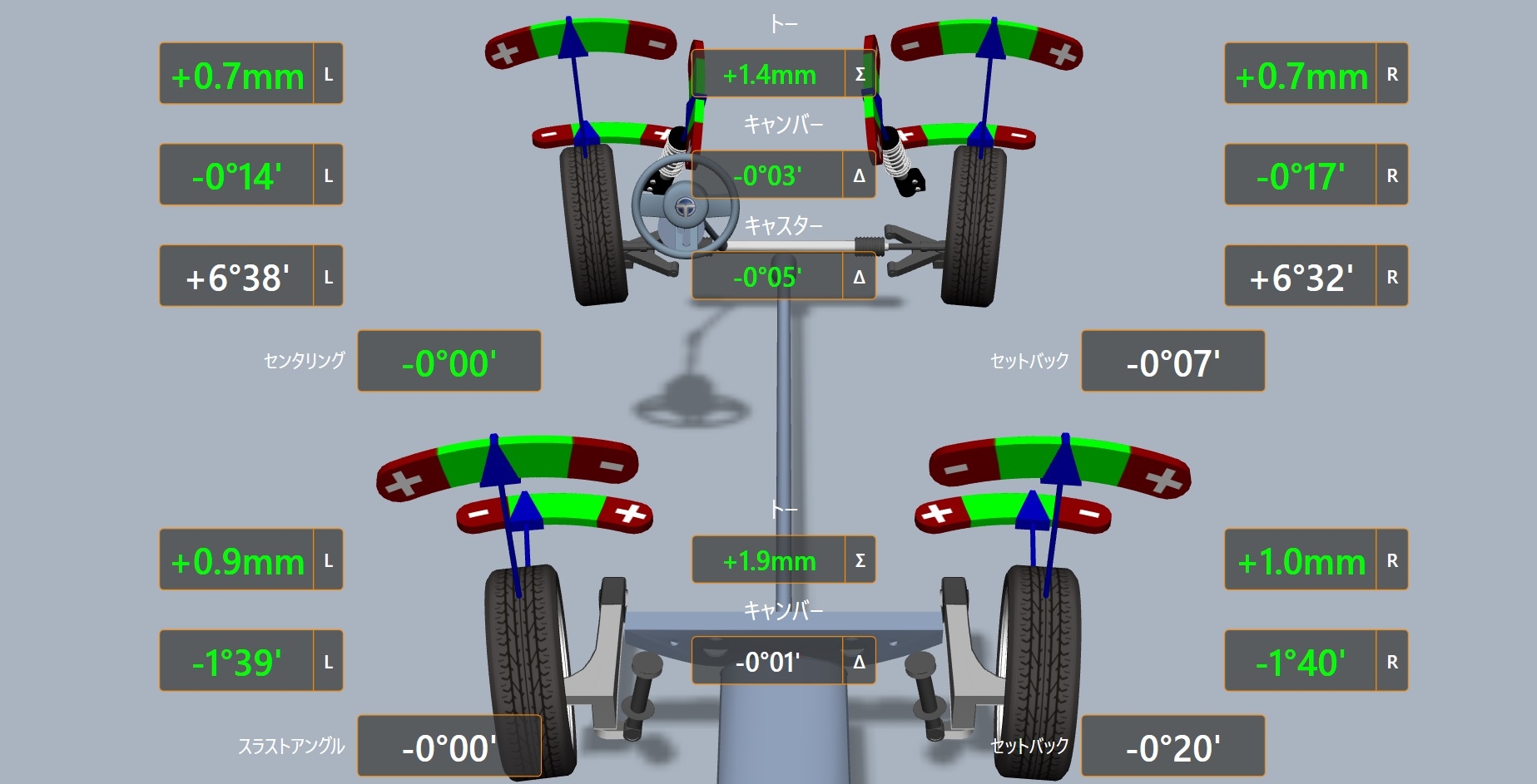 リアは元々揃っていましたがBMWは基準値の範囲が狭く細かいので微調整しました。