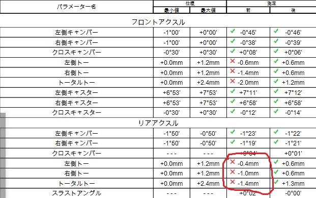 アライメントの数値がずれていないか測定させていただきました。