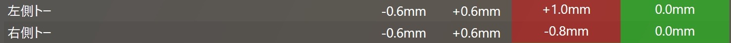 調整前は左側が+1.0ミリ、右側が-0.8ミリでした。ハンドルがまっすぐでタイヤが右にズレていたことになりますね。