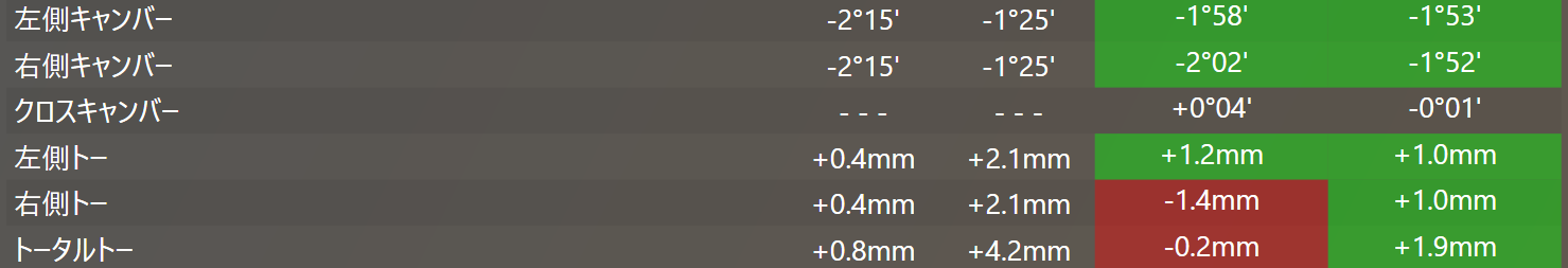 数値のズレとしてはフロント側のトーがイン側にずれていたのとリア側は左右でトーイン、トーアウトがちぐはぐになっていました。