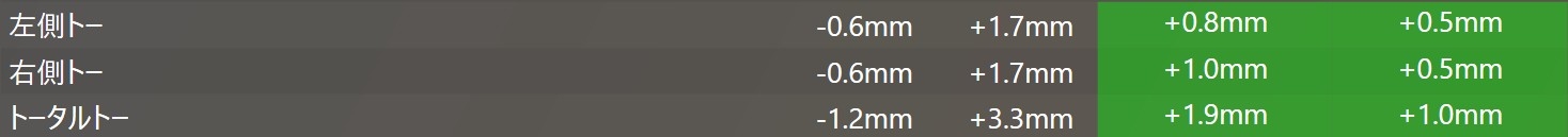 フロント側のトー、リア側のトーになります。