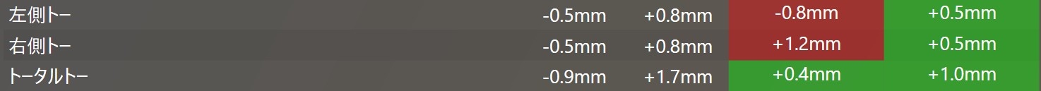 数値のズレとしてはフロント側の左側がトーがアウト側、右側のトーがイン側にズレていました。