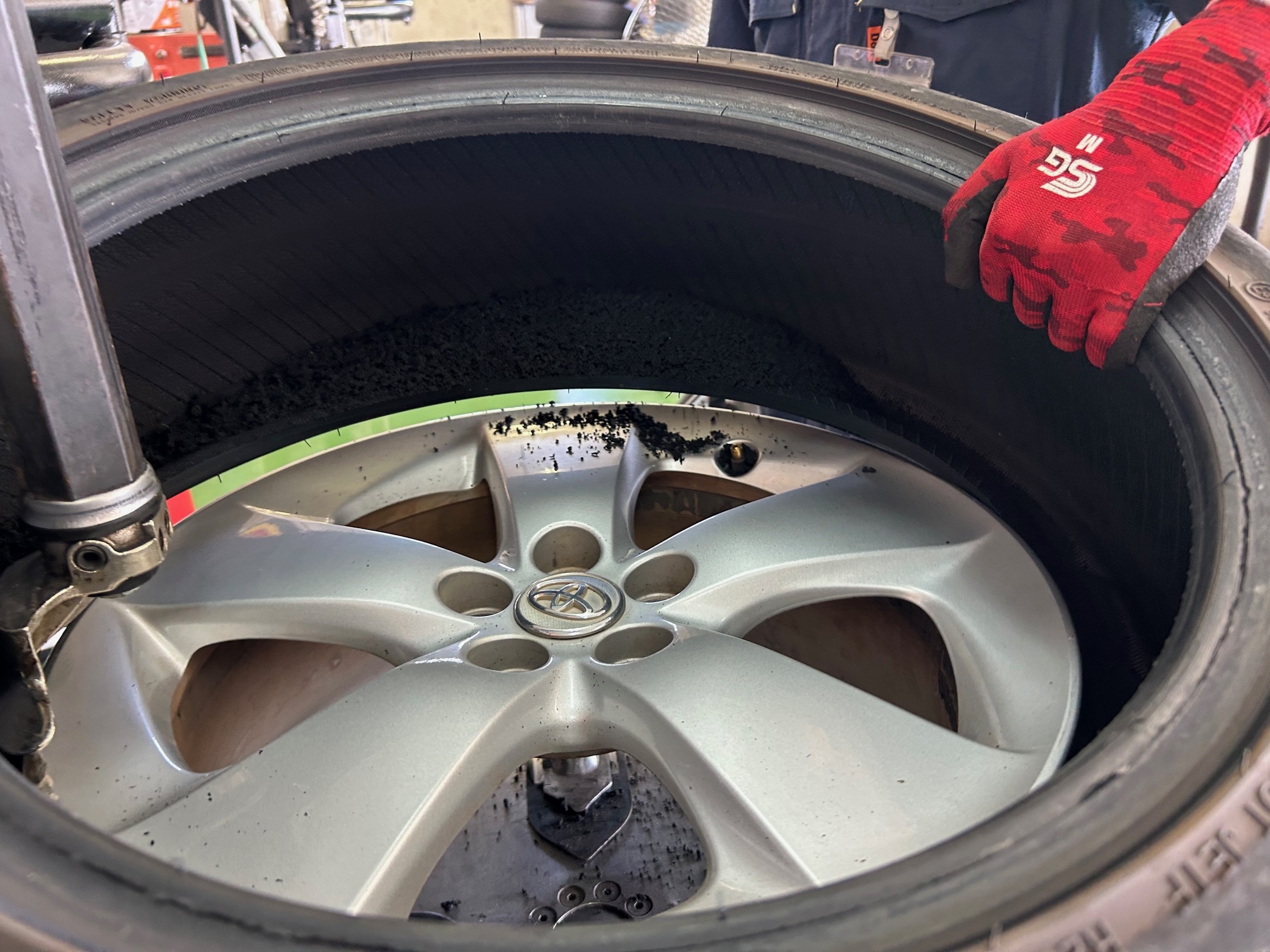 中から砂のようなタイヤの破片が