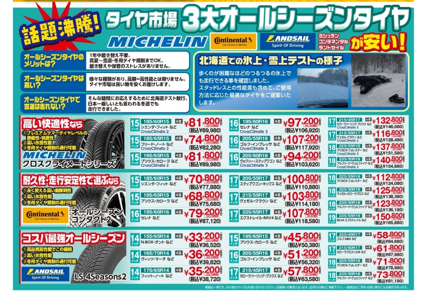 チラシでもご紹介している通り、ミシュランなどの主要ブランドは、北海道での氷上・雪上テストを実施。