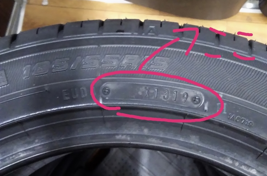 写真で丸く囲ってある部分がタイヤが作られた年が書いてある部分です!