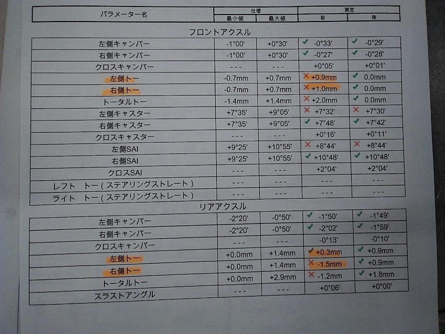 フロントの左右のトー角、右後のトー角がズレてしまっています...