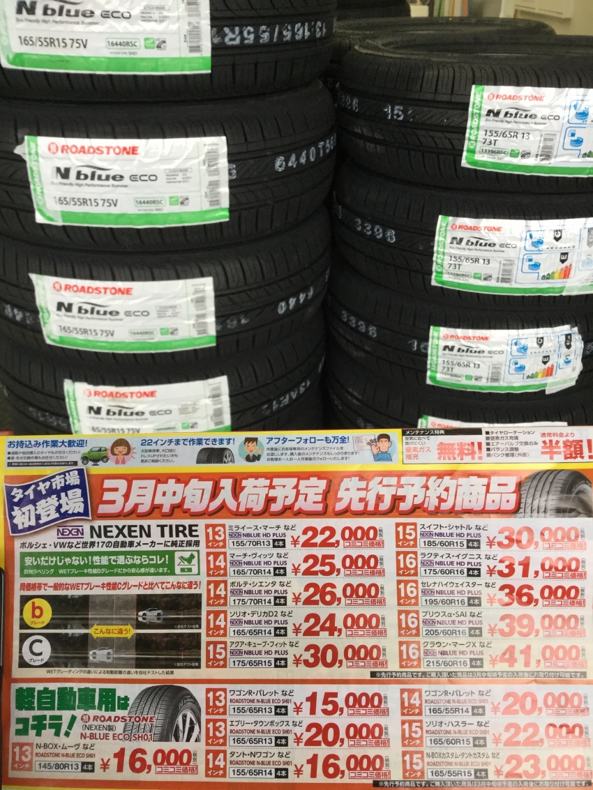 広告に掲載しております、3月中旬入荷予定、先行予約商品のネクセンタイヤが順次入荷いたしております。