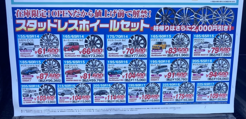 只今、タイヤ市場館林店ではスタッドレスタイヤ