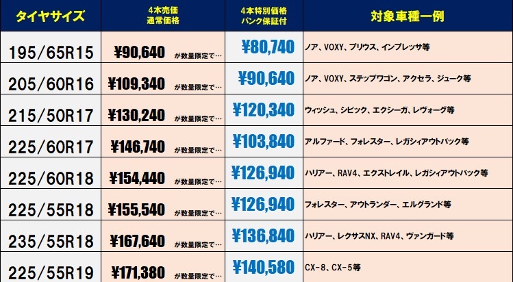 ★タイヤサイズ 通常価格 → 特別価格 税込(パンク保証付)★