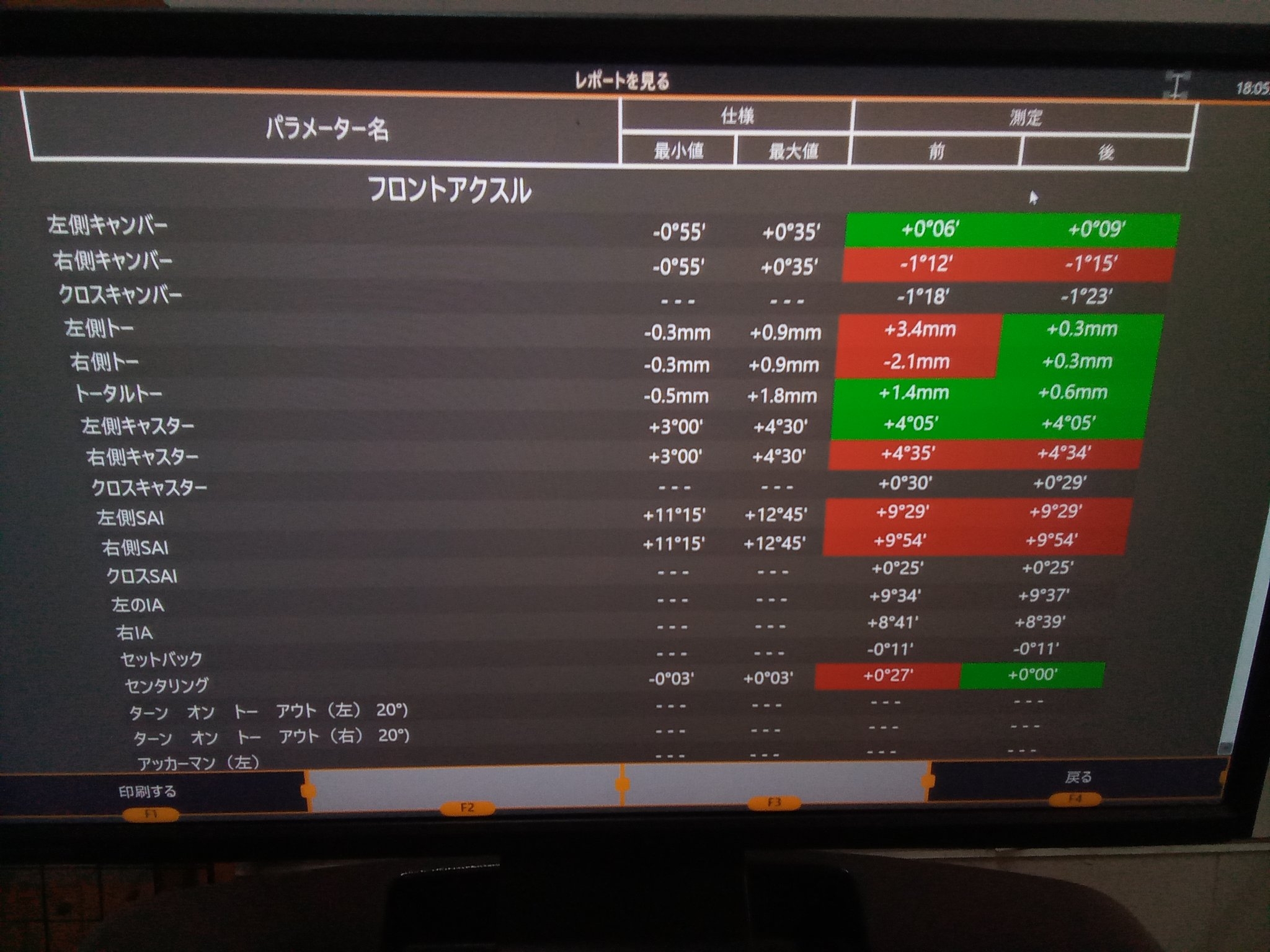 フロント左のトーが3.4mmトーイン、フロント右のトーが2.1mmトーアウト