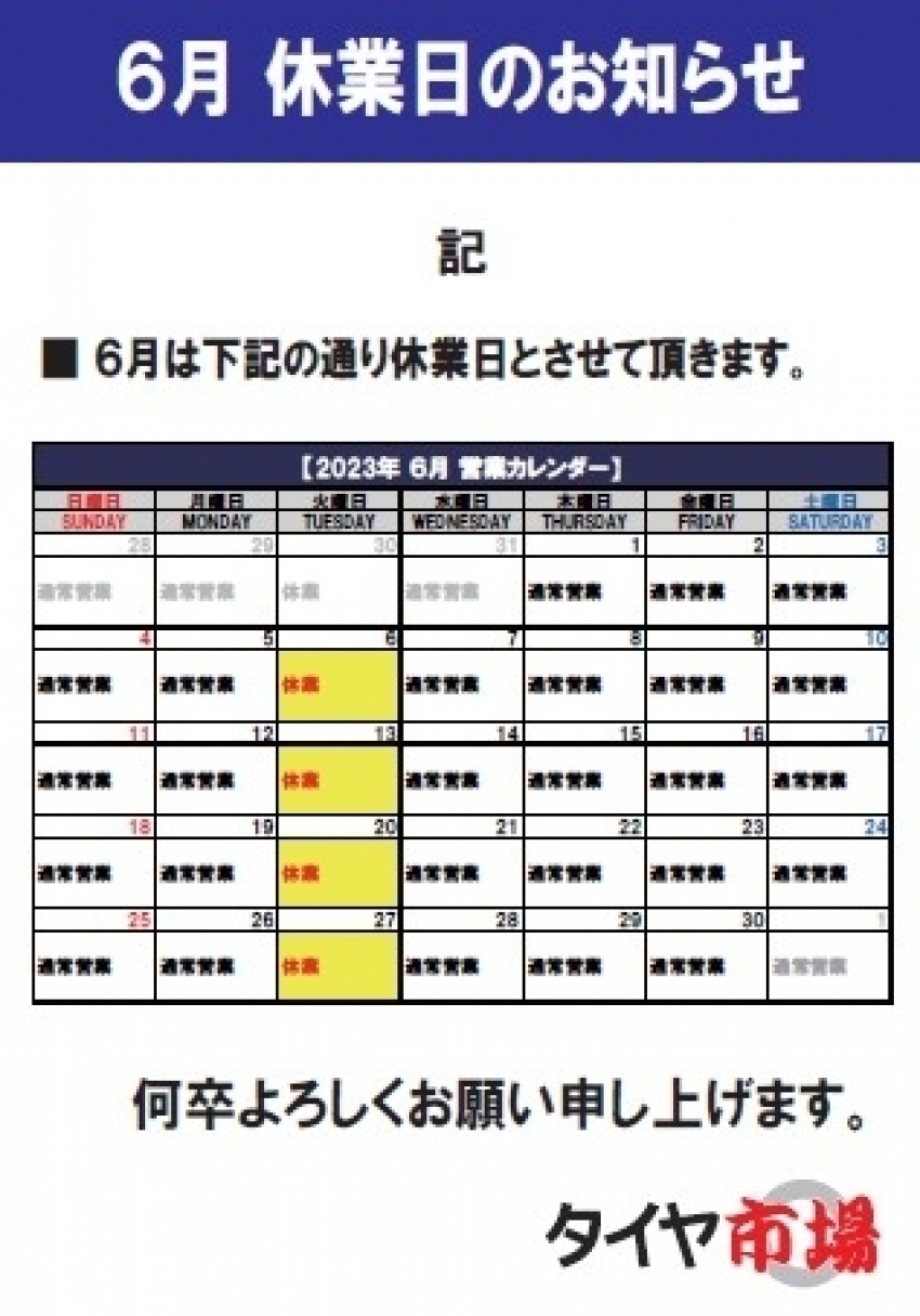6月定休日のお知らせ!!