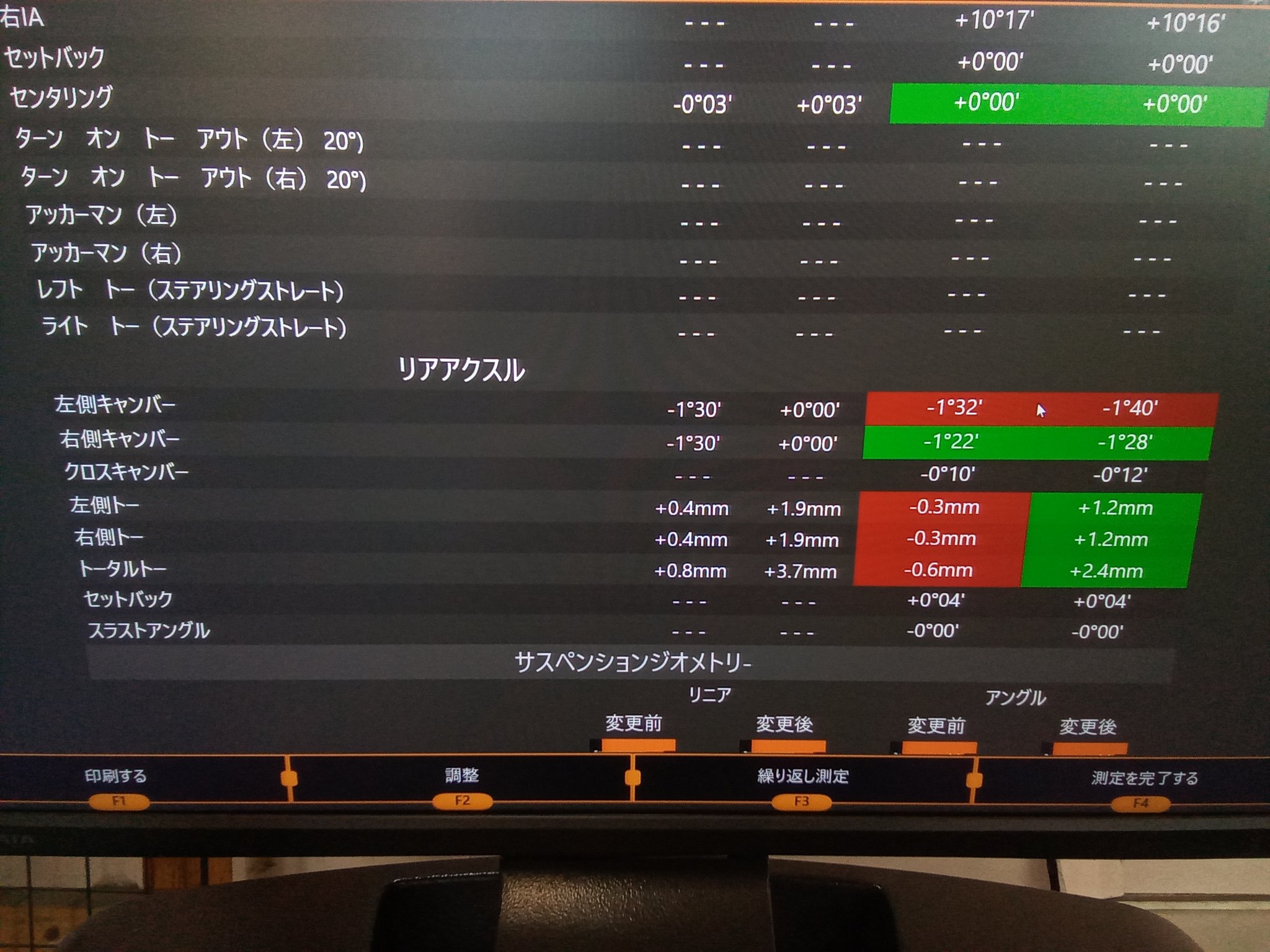 リア左のトーが0.3mmトーアウト、リア右のトーが0.3mmトーアウト、