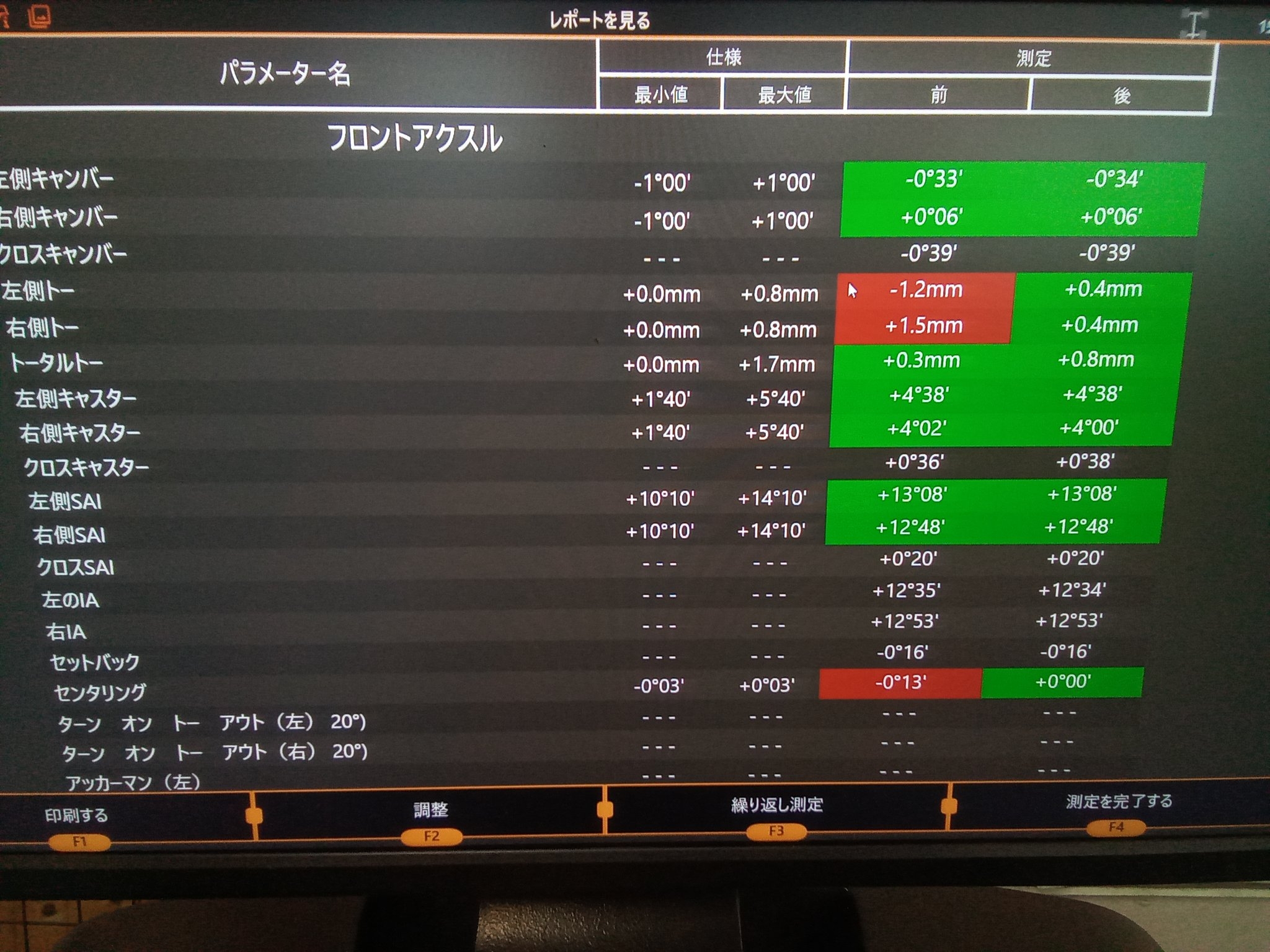 フロント左のトーが1.2mmトーアウト、フロント右のトーが1.3mmトーイン