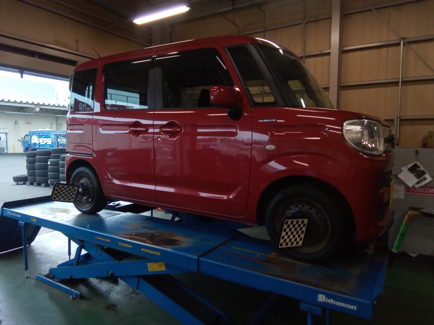 スズキ スペーシア アライメント調整 in タイヤ市場足利店!!普通は超高いアライメント調整がディーラーの半額以下で!! 足利・太田・桐生エリアにお住いの方、その他の地域にお住いの方も是非!