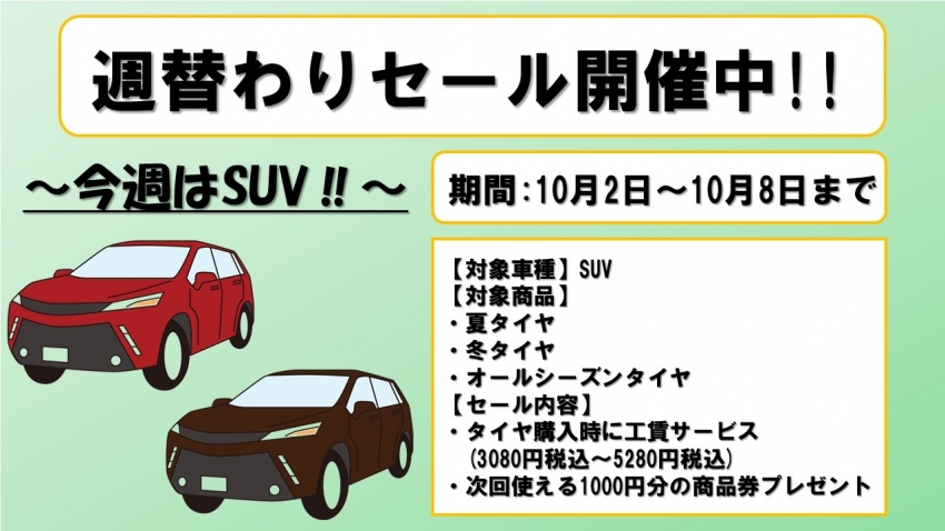 週替わりセール開催します!夏タイヤ・冬タイヤ・オールシーズンタイヤのSUV向けタイヤが安い!「エクストレイル」「ハリアー」「CX-5」などにお乗りのお客様は必見(^^)/