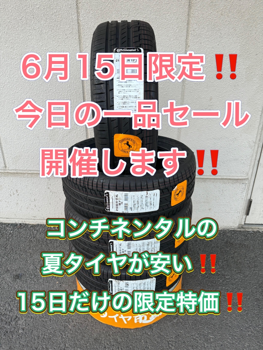 今日の一品セール開催!!本日6月15日(土)にご来店ご購入の方限定企画!!コンチネンタルの夏タイヤが安い!!旧年製の為、お値引きでのご提供!!足利・太田・桐生エリアにお住いの方、その他の地域にお住いの方も是非!