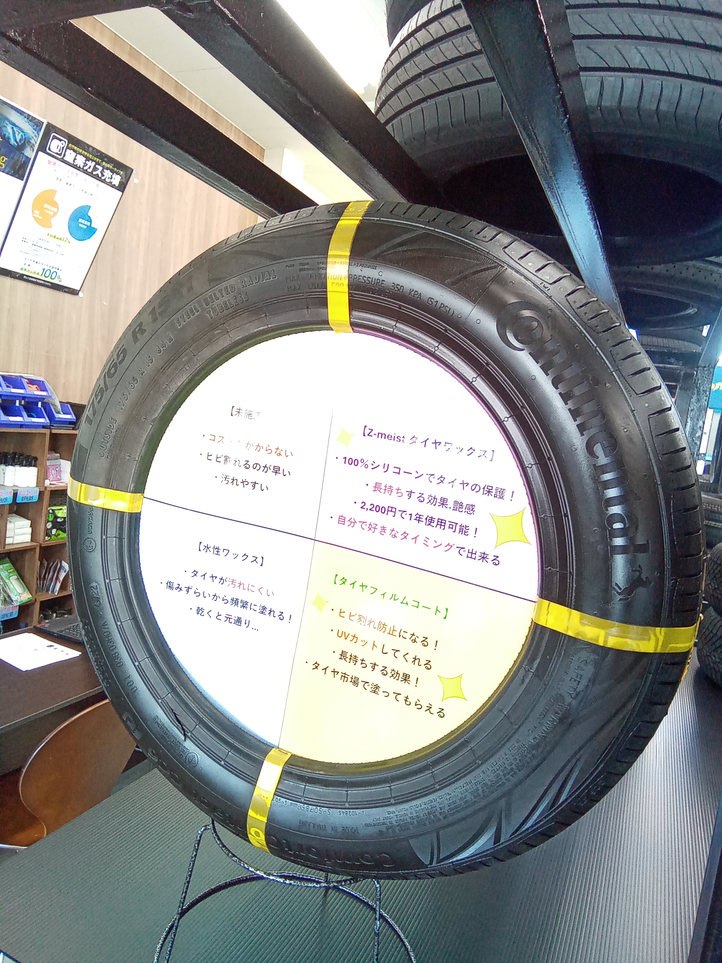 タイヤフィルムコートで紫外線を防ぎ、タイヤワックスで日々の汚れを付かないようにします!