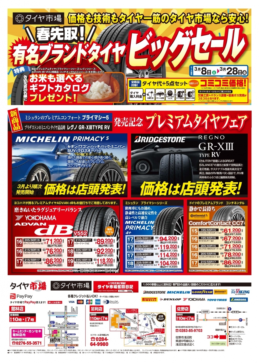 WEBチラシ情報!春先取り!有名ブランドタイヤビックセール開催!!!お得な情報もあるかも!!!足利・太田・邑楽・大泉・新田・桐生・熊谷・羽生近郊の方ごらんください!!!