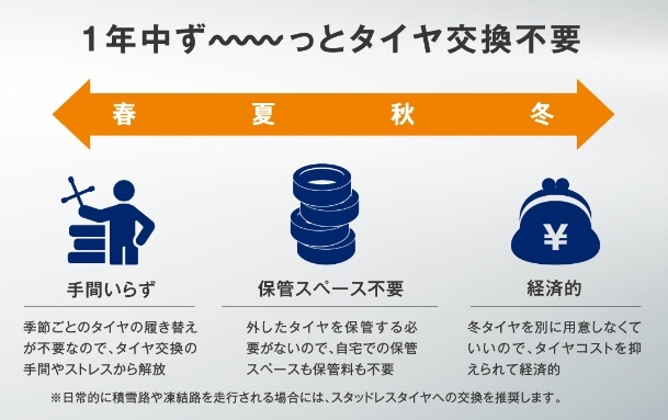 今回の目玉は、なんと言っても オールシーズンタイヤ 特集です。夏+冬シーズン雨でも雪でも一年中安心して走行!!