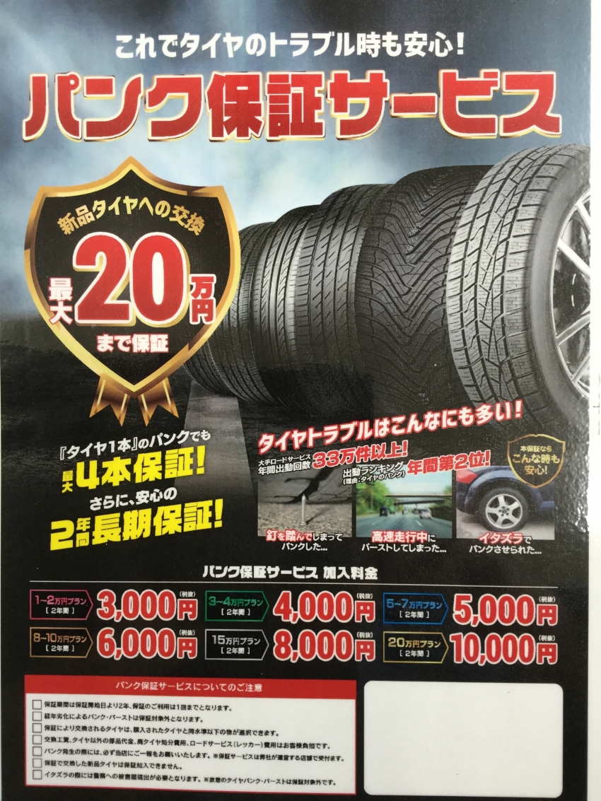 タイヤ市場では、タイヤ4本お買上げ頂きましたお客様にパンク保証サービスをオススメしております。