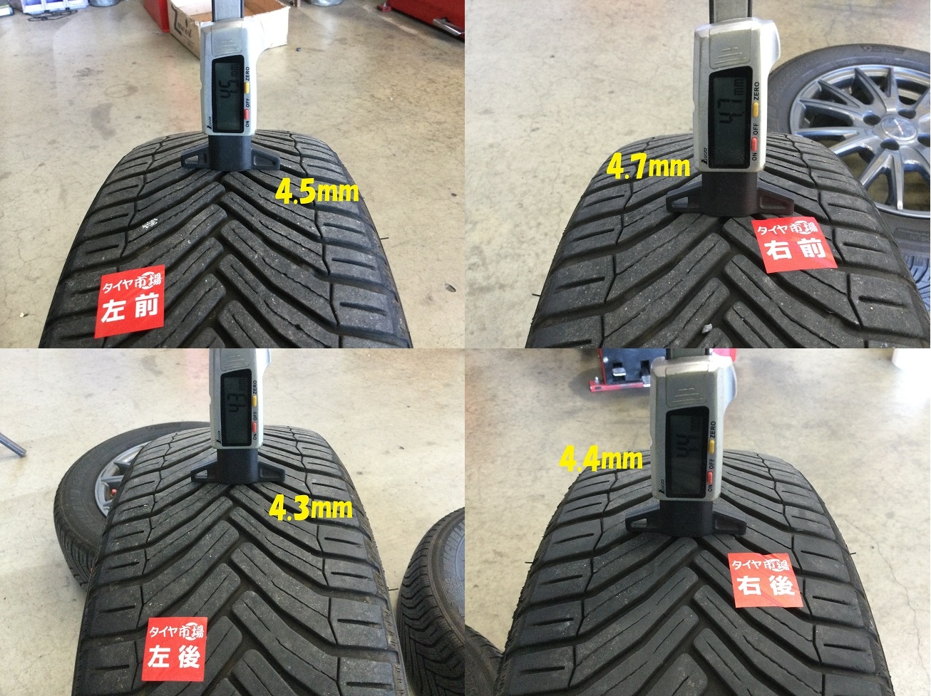 今回計測時⇒最深部(中央):右前4.7ミリ;右後4.4ミリ 左前4.5ミリ;左後4.3ミリ
