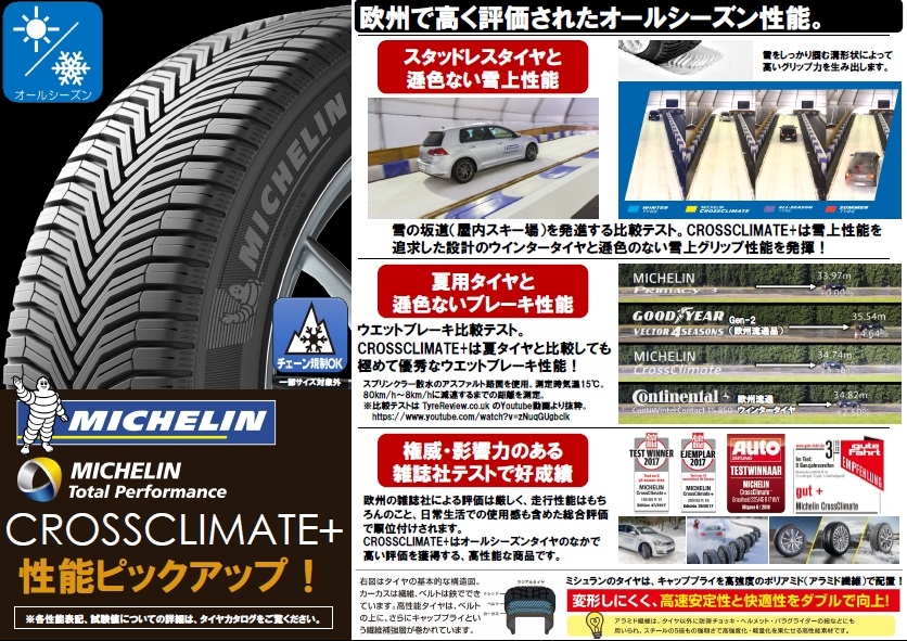 ミシュラン クロスクライメート+ は、当店の過去ブログにも度々登場しているようにかなりオススメなオールシーズンタイヤです。