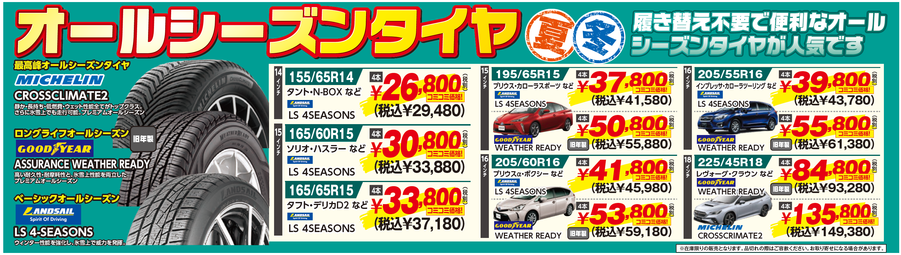 多くのお客様がスタッドレスタイヤ・オールシーズンタイヤなどがお値打ちにご購入できる最後のチャンスになるかもしれません!!