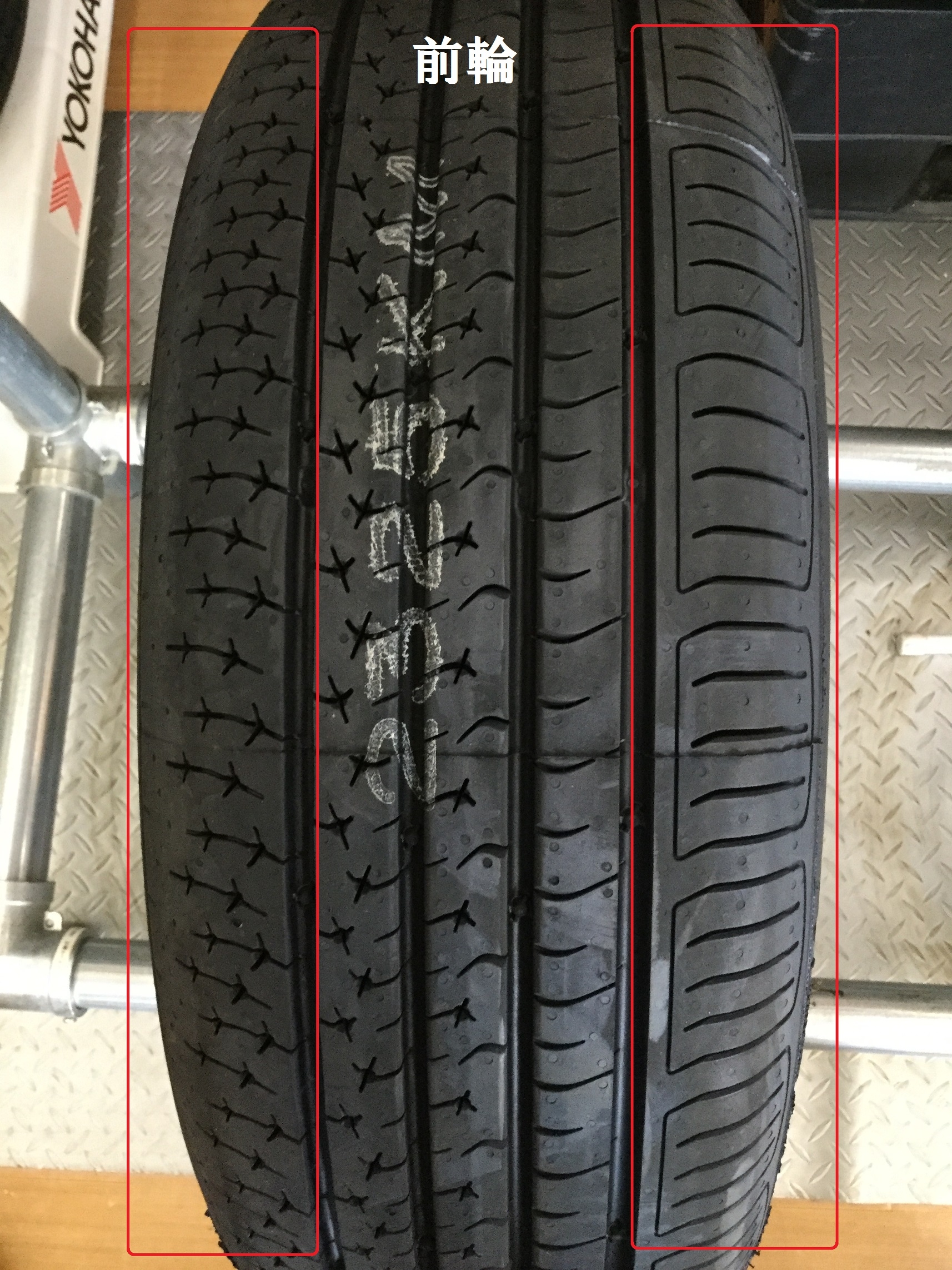 前輪は写真の赤枠で囲った、タイヤの両脇(ショルダー)が減りやすくなります。前輪に装着したまま、走行を続けていると、両脇だけが減ってしまいます!![]()